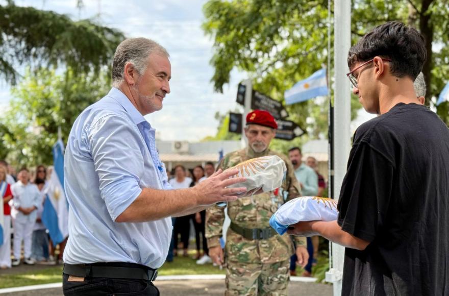 Del acto participaron autoridades municipales, concejales, representantes del Centro de Veteranos de Ramallo, instituciones educativas y fuerzas vivas, junto a las banderas de ceremonia de escuelas locales.